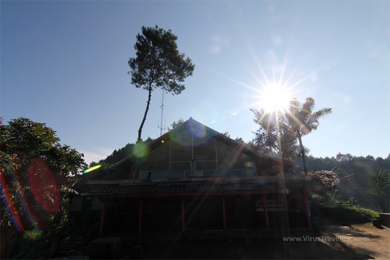 Dari bawah tempat kami berada saat itu, kami akhirnya melihat lokasi warung Daweung. Kami pun berbalik arah. Ternyata dari portal tadi memang tidak begitu jauh lagi, jalan pintu masuknya persis berada dipertigaan yang kami lewati. Kami tidak memperhatikan ada pertigaan menanjak karena masih memang masih gelap. Jalannya berbatu, cukup menanjak dan licin. Saya cukup susah mengendalikan mobil Terios yang kami bawa hingga parkiran warung Daweung. Saya menyerah dan memarkirkannya tidak jauh dari warung itu dan melanjutkan jalan kaki ke atas.